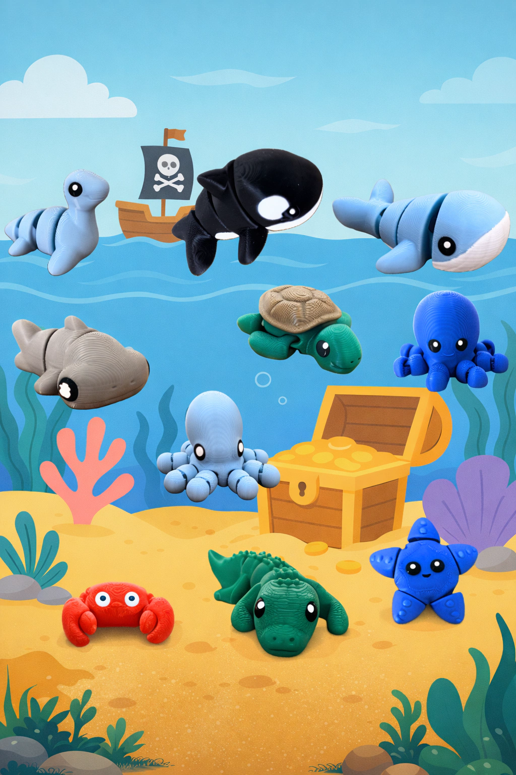 Cada animalito marino está diseñado con formas suaves, colores vibrantes y materiales duraderos para acompañar el juego real de todos los días.